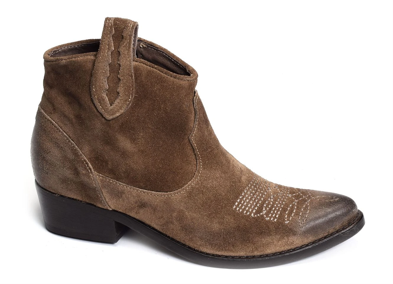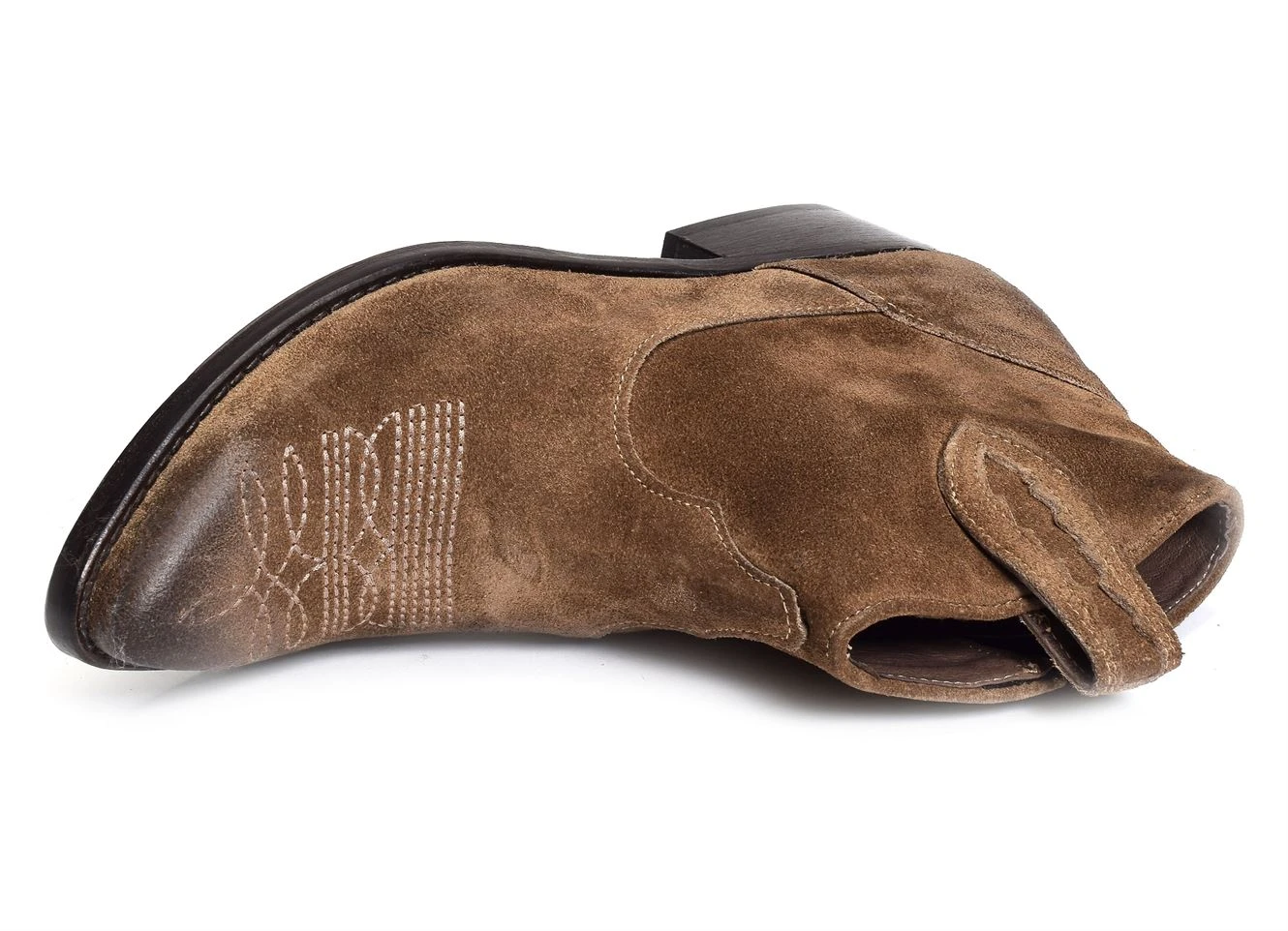 Fabriquée en cuir, cette bottine est dotée des supiqûres propres aux santiags sur la tige.