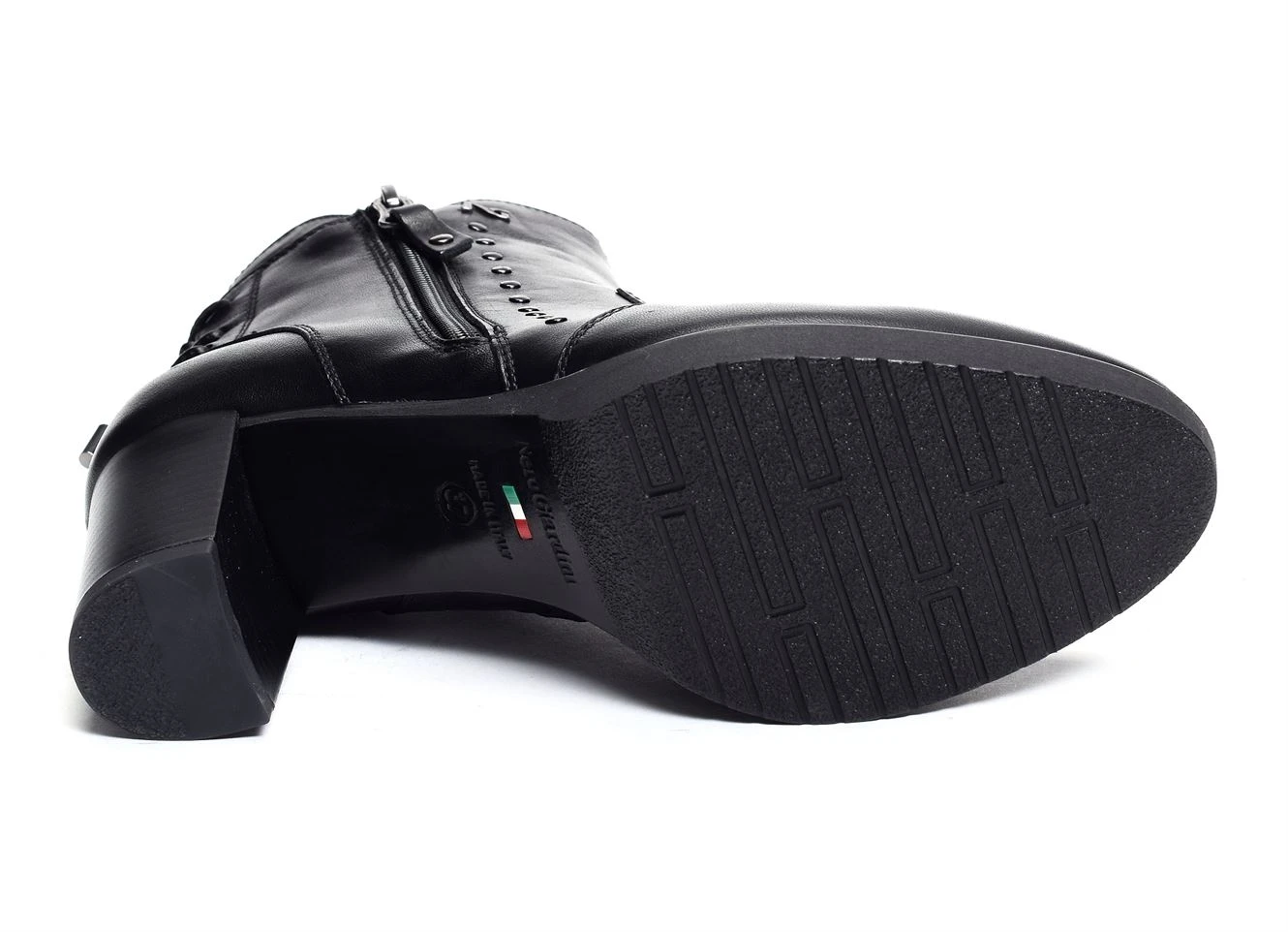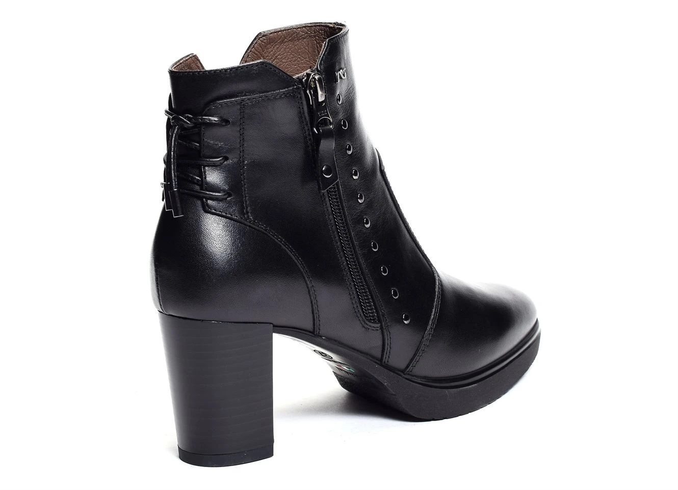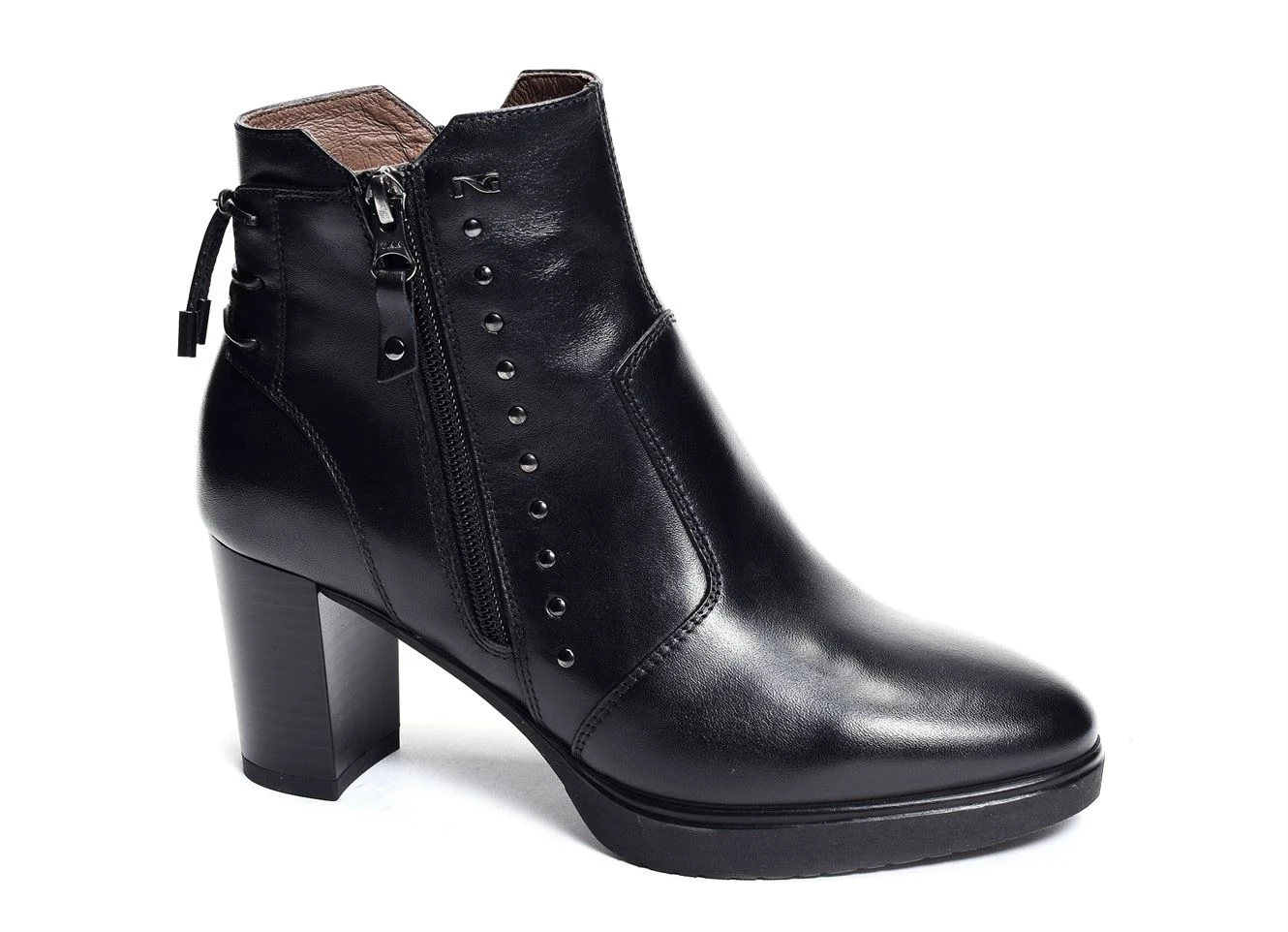 Disponible en plusieurs couleurs, la 16700 est une bottine en cuir de la marque italienne Nerogiardini. Réhaussée de petits clous, cette bottine dispose d’une fermeture éclair et d’une fine bride croisée en cuir au niveau du talon. Son talon de 7cm permettra d’élancer votre silhouette et de vous donner une démarche féminine tout en restant confortable. Sobre et élégante, vous pourrez facilement porter cette chaussure avec des tenues chics pour compléter le look ou bien avec des tenues décontractées pour amener une touche d’élégance.