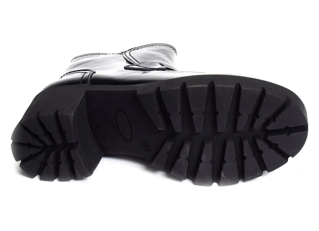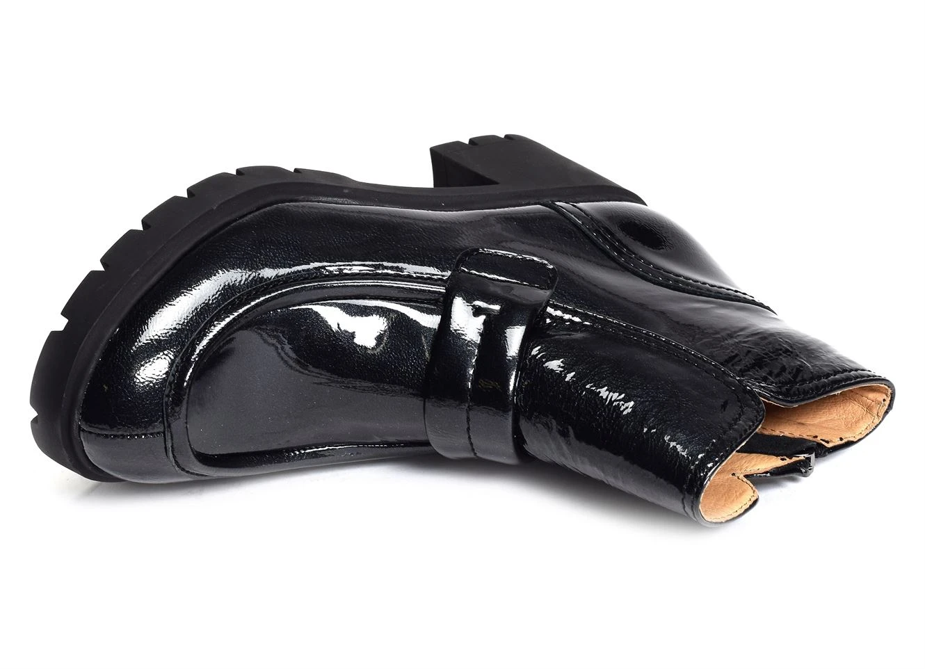 Cette bottine s’habille d’une tige en cuir vernis souple.