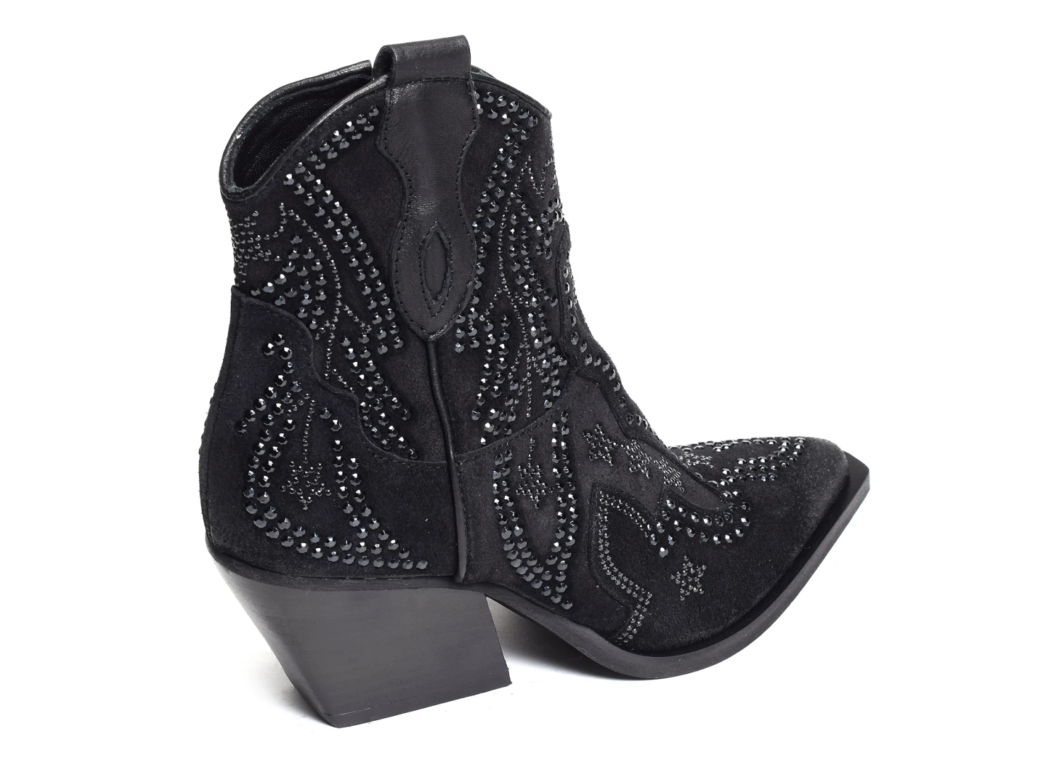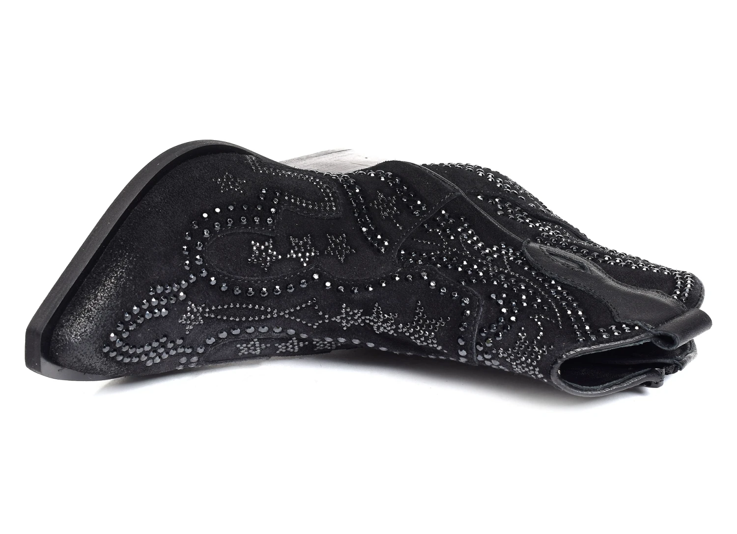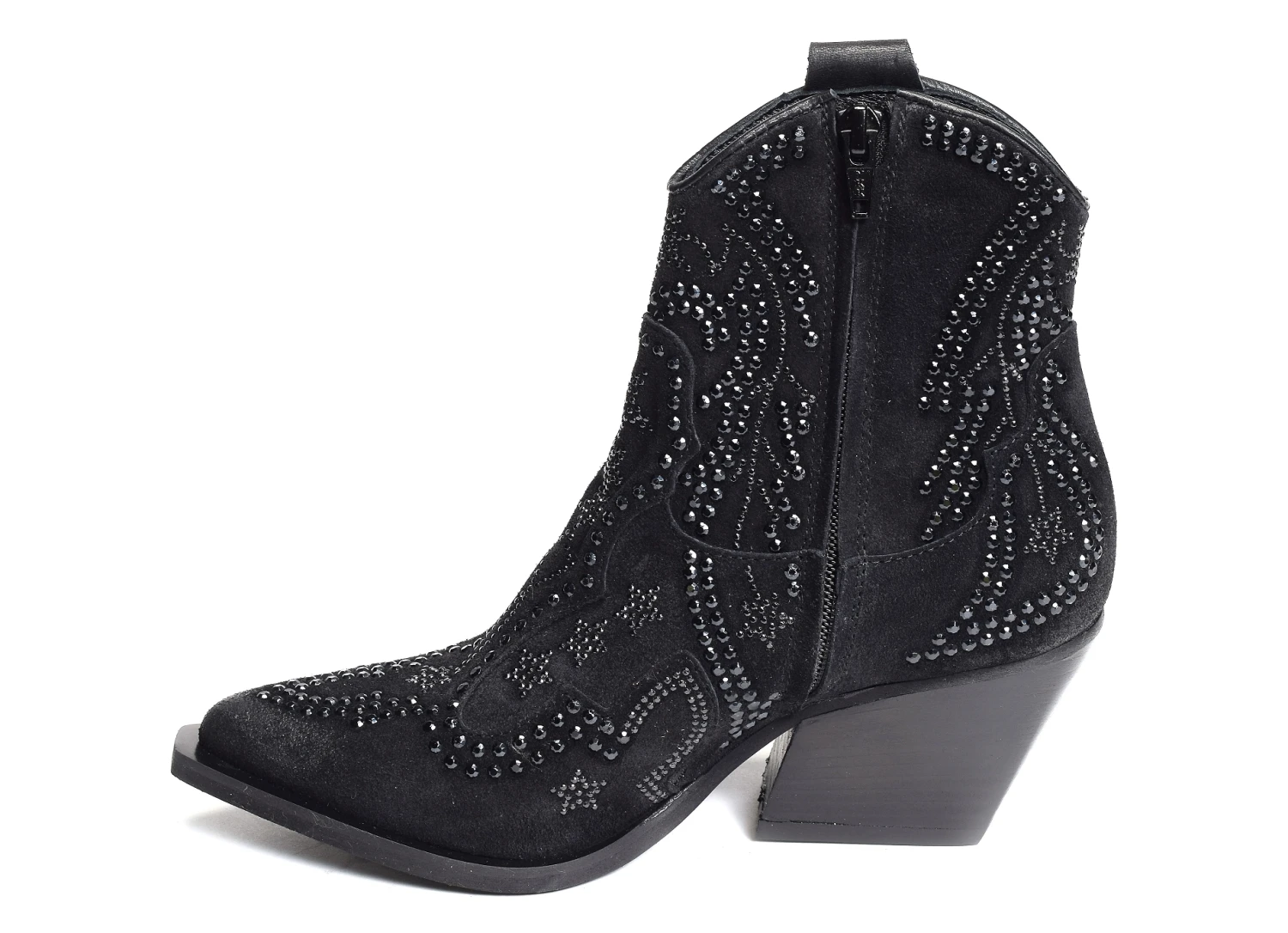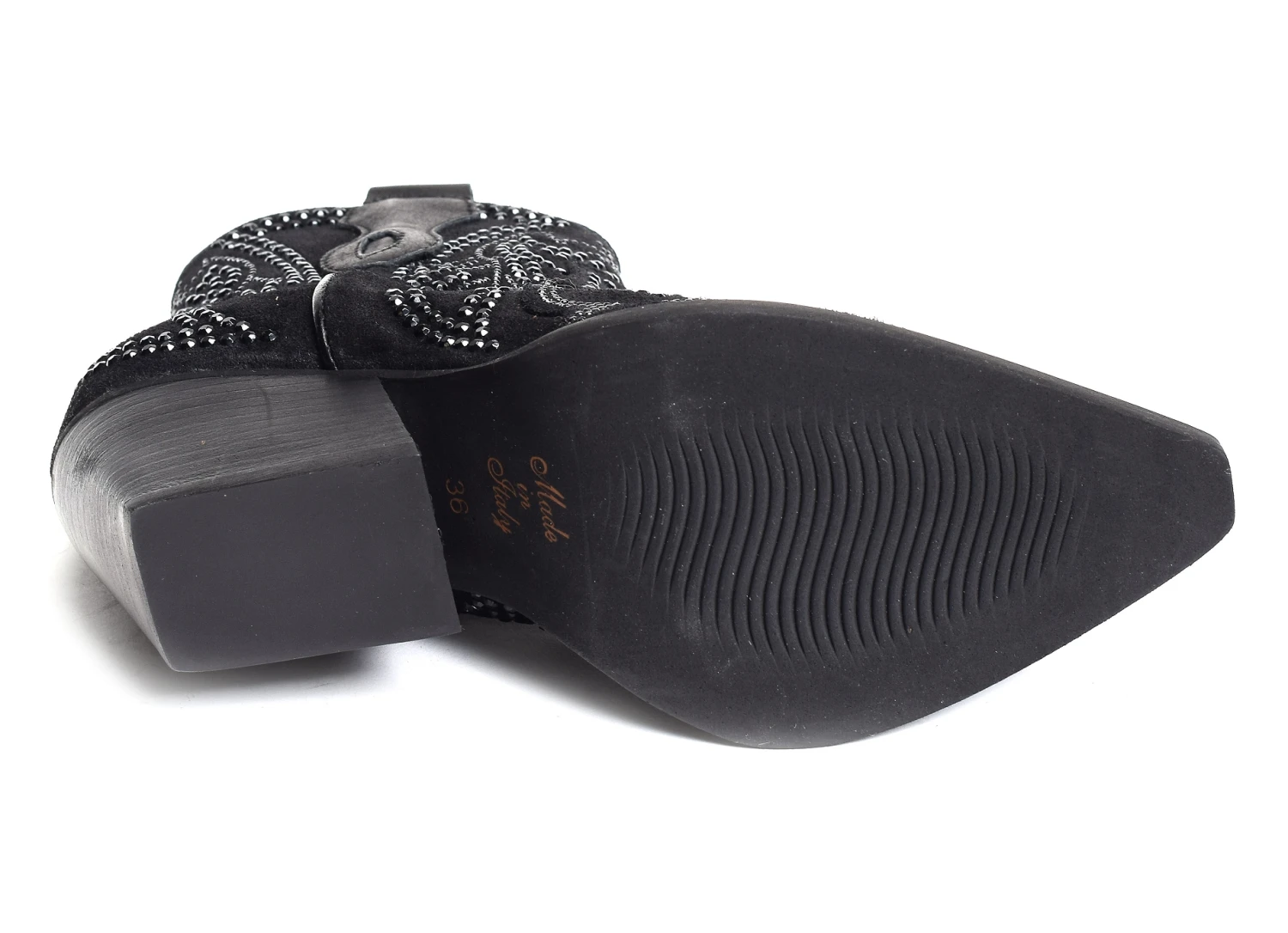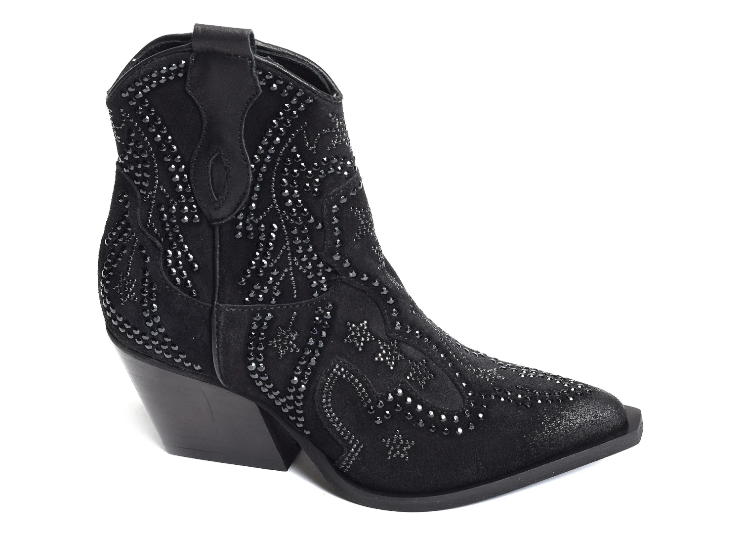 Complétez tous vos looks de saison avec cette santiag ultra moderne! Avec son talon biseauté et ses strass, elle accessoirisera à merveille vos tenues.